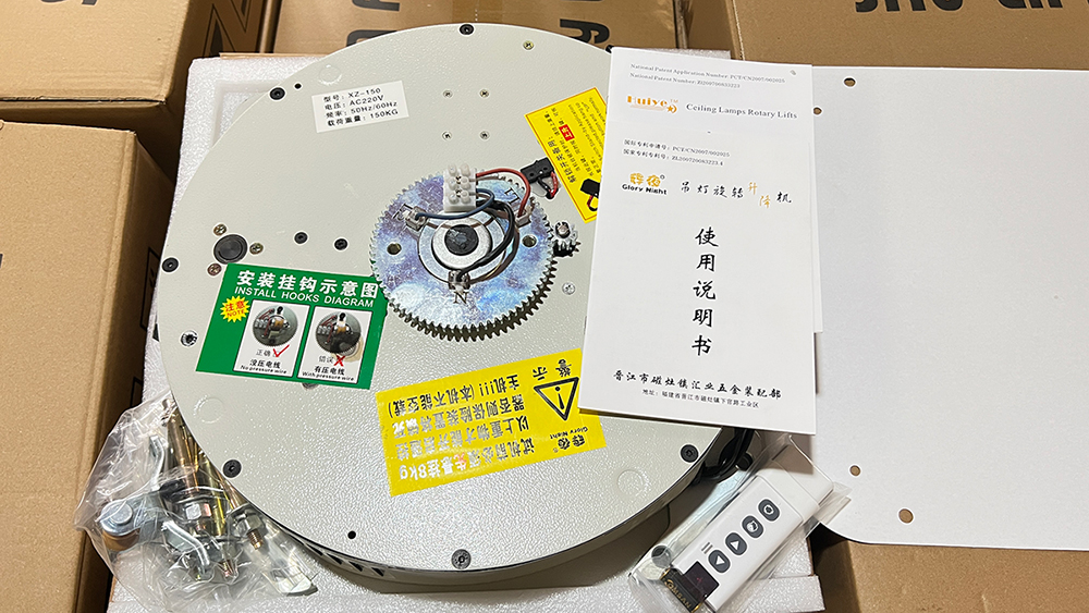 1、裝吊燈旋轉(zhuǎn)升降機的接線盒,按接線圖把輸入端電源(AC220V)火線,零線,接下線逐條對應(yīng)連接;